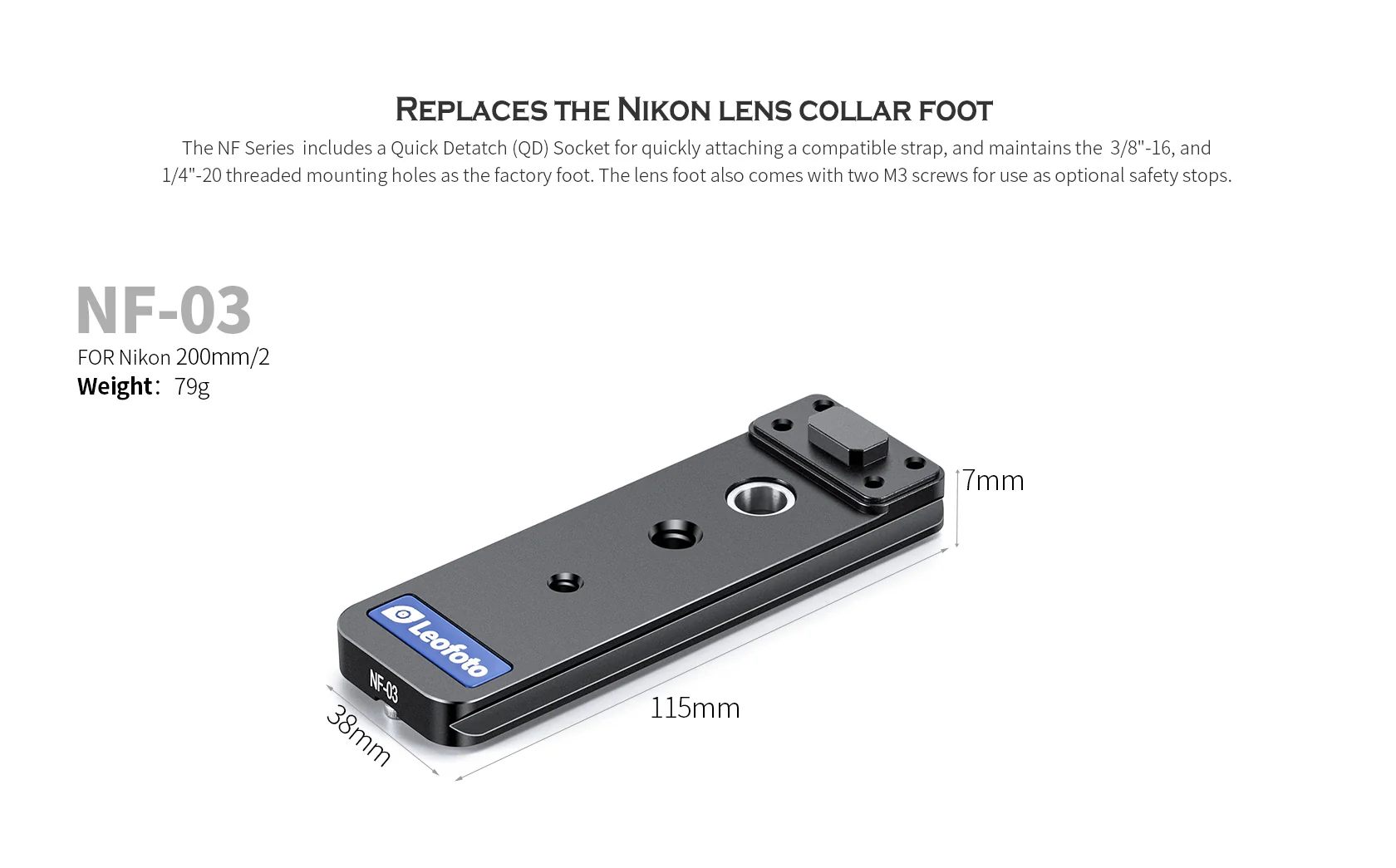 Aiming to improve on the default design, the Leofoto NF-03 is a collar foot for Nikon AF-S NIKKOR 200mm f/2G ED VR II meticulously engineered to provide a lower profile and a lower center of gravity for a better balance. Two safety stops are located on the bottom of the foot, which prevents accidental lens release when a quick release receiver clamp is partially open.
