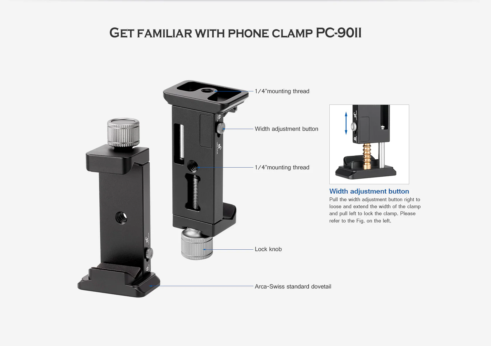 The Leofoto PC-90II is an adjustable smartphone clamp that allows you to securely mount your phone onto a tripod or other support system. The height of the phone clamp can be adjusted from 56-90mm / 2.2-3.5 inches, with a slider on the side that locks the height in place.