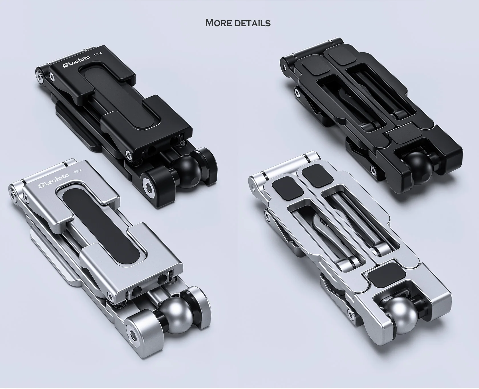 The Leofoto PS-4 is a compact and portable foldable phone clamp designed to securely hold smartphones in place for photography and videography. The clamp is made of high-quality CNC-machined aluminum and features a foldable design that makes it easy to carry in your pocket or camera bag. It has a standard 1/4" screw hole.