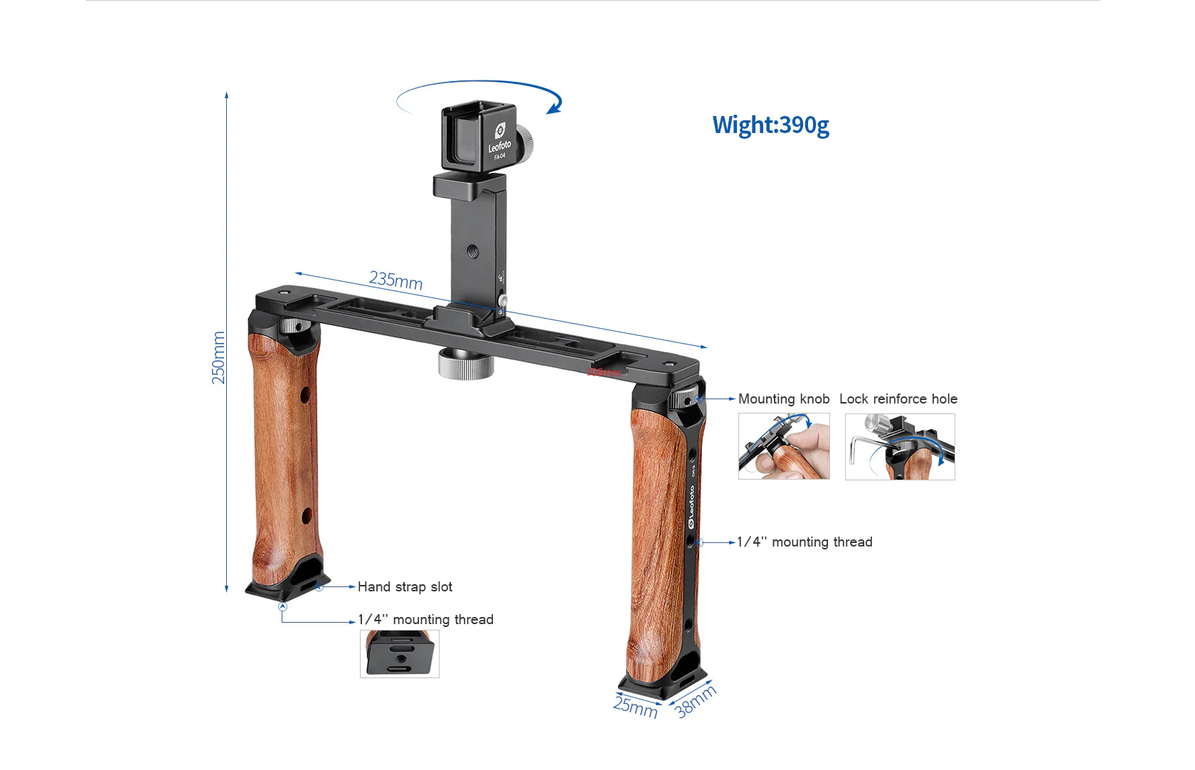 The two CH-2 Rosewood Handles are 142mm (5.6 inches) long and weigh only 104 grams (3.67 ounces) each, making them comfortable to hold. The rosewood finish adds a touch of luxury to your mobile setup. The PC-90II Smartphone Clamp is suitable for all current smartphones and can be adjusted to fit phones ranging from 56mm (2.2 inches) to 90mm (3.54 inches) in height. The FA-04 Cold Shoe can be mounted on top of the Smartphone Clamp to attach accessories such as lights or microphones.